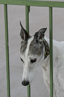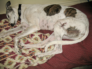 Bee came to live with us on April 10, 2011 as a very active 9 year old former brood hound. She raced well and then was a mother to 4 litters. Previously adopted out, she was injured at the adopter's home and nearly severed her right patellar ligament. Surrendered back to our group, she was in foster care when she was injured by another dog and lost a large chunk of flesh from the left rear leg. After all injuries were healed, she was being fostered by our group president and wasn't planned for re-adoption. We met her and fell in love with her funny personality and youthful activity level. She's a great match for our youngest, Pearl, and they are good playmates.