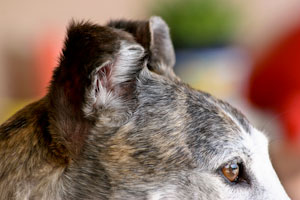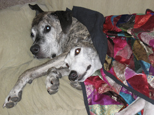 She appears to need sympathy. Not. Although she hops around on three legs most of the time, she is able to run using the front leg more or less as a stabilzer. In one of the annual Greyhound events in Kanab, UT she was clocked by a radar gun at 34 MPH. She wasn't the fastest dog that day, but when they learned she was 8 years old (at that time) and had a steel plate, she got an honorary gift basket!