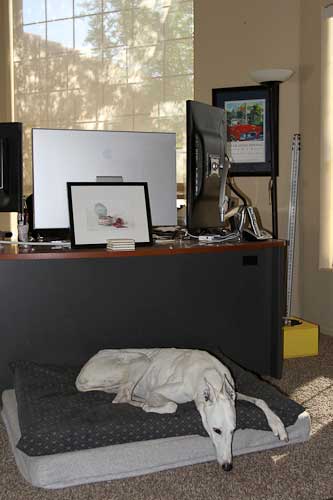 April 2012, Debbie sends an email to Nick with a link to a website and says "don't open this link". Of course he opens it. He's looking at available senior hounds at Colorado Greyhound Adoption (CGA). He calls out to Deb and asks "What am I supposed to see here?" as he scrolls down the page. Then he sees her and says "Ohhhhhhhhhh....". He knew exactly which girl he wasn't supposed to see, and the project began.