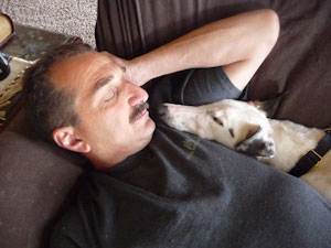 We were a little worried that she was so young (not yet 3 years old at the time), but she came home and fit right in. She's very smart and learned quickly the rules of the house. She figured out the doggie door the first day and never had an accident in the house. Not bad for right out of the kennel and never in a home. She's definitely Nick's girl. Every night she comes right to bed and jumps up next to him and presses herself to his side, where she stays all night long. She's content to spend the afternoon in Debbie's office, but snuggles with Nick at every chance.