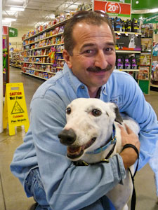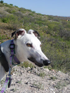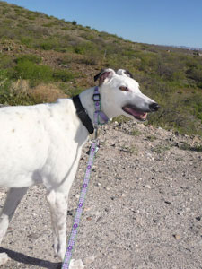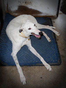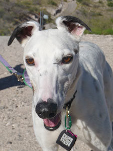 We watched her races on the internet broadcasts from the Phoenix Greyhound Park. What a racer! We've captured one of the races and posted it to YouTube. She is ahead from the beginning and quickly puts seven lengths between her and the next dog and easily wins. In November she pulled a muscle and was not racing when the track closed in December. In February on Valentine's Day weekend we made a trip to Avondale just to see her. Her trainer must have seen how special she was to us, because a couple of weeks later he contacted us and asked if we could take her now. Really?!? Woohoo!